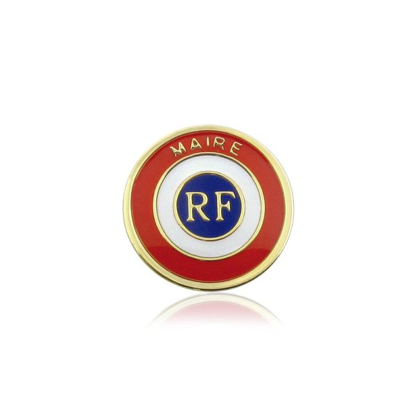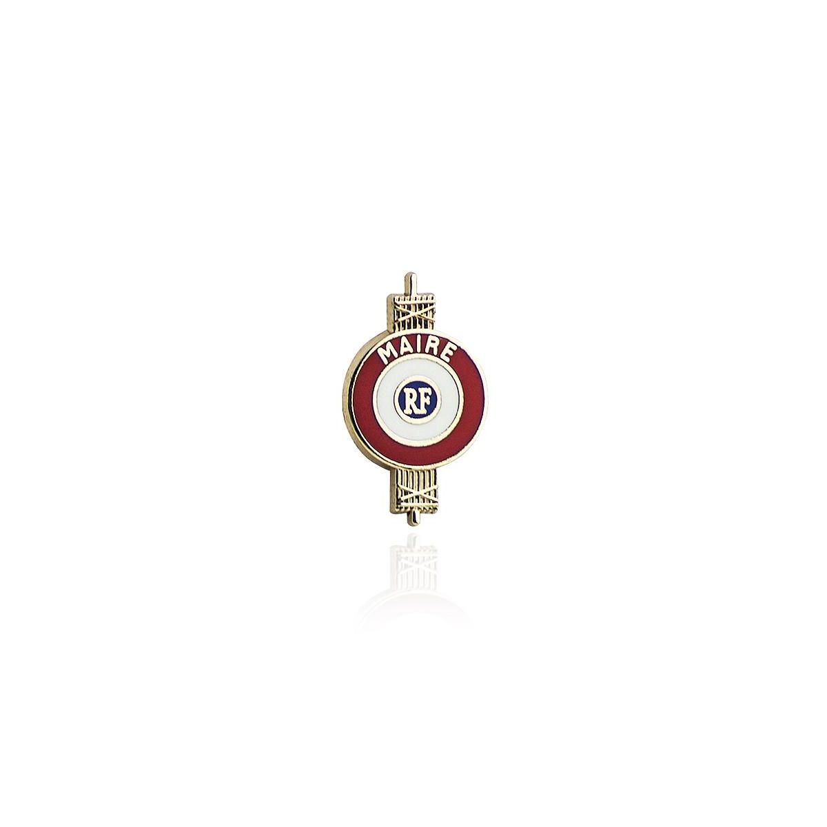 Cet insigne en métal doré est destiné au Maire. Celui-ci est composé d'une cocarde tricolore émaillée et recouverte de résine. Sur la cocarde se trouvent les mentions "RF" et "Maire" en métal doré. La cocarde est fixée sur un faisceau de licteur symbole de la République Française. Sa hauteur est de 14 millimètres. Fixation pin's.