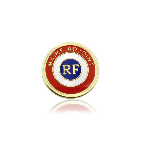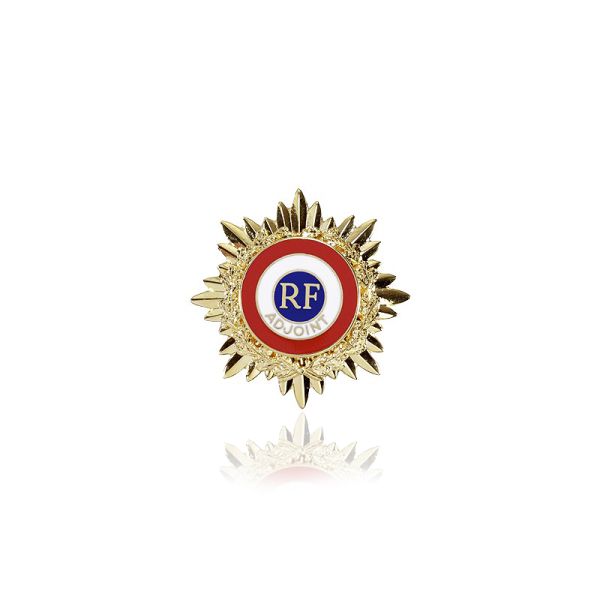 Cet insigne en métal doré est destiné au Maire-Adjoint. Celui-ci est composé d'une cocarde tricolore émaillée et recouverte de résine. Sur la cocarde se trouvent les mentions "RF" et "Adjoint" en métal doré. Cette dernière est entourée d'une couronne de chêne et laurier en métal doré. Le diamètre est de 18 millimètres et la fixation est de type pin's.