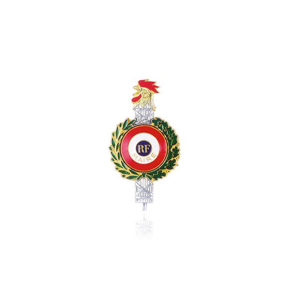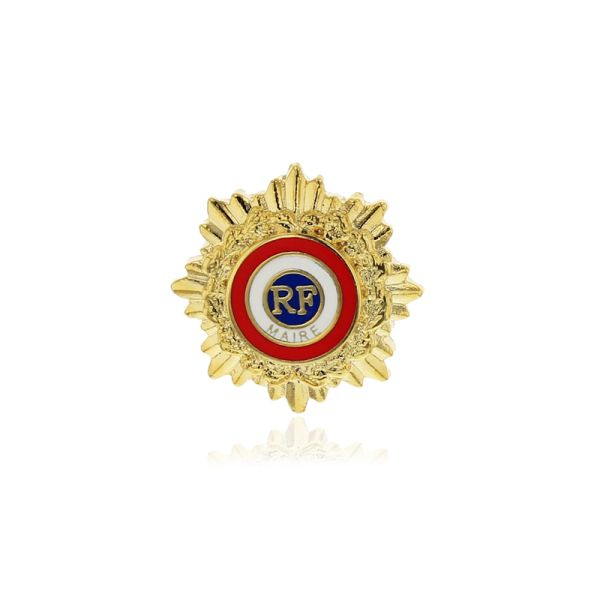 Cet insigne en métal doré est destiné au Maire. Celui-ci est composé d'une cocarde tricolore émaillée et recouverte de résine. Sur la cocarde se trouvent les mentions "RF" et "Maire" en métal doré. Cette dernière est entourée d'une couronne de chêne et laurier en métal doré. Le diamètre est de 18 millimètres et la fixation est de type pin's.
