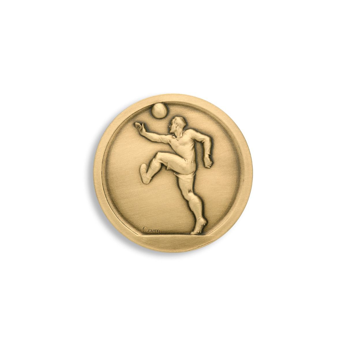 Cette médaille estampée met en scène un joueur de foot frappant dans le ballon.