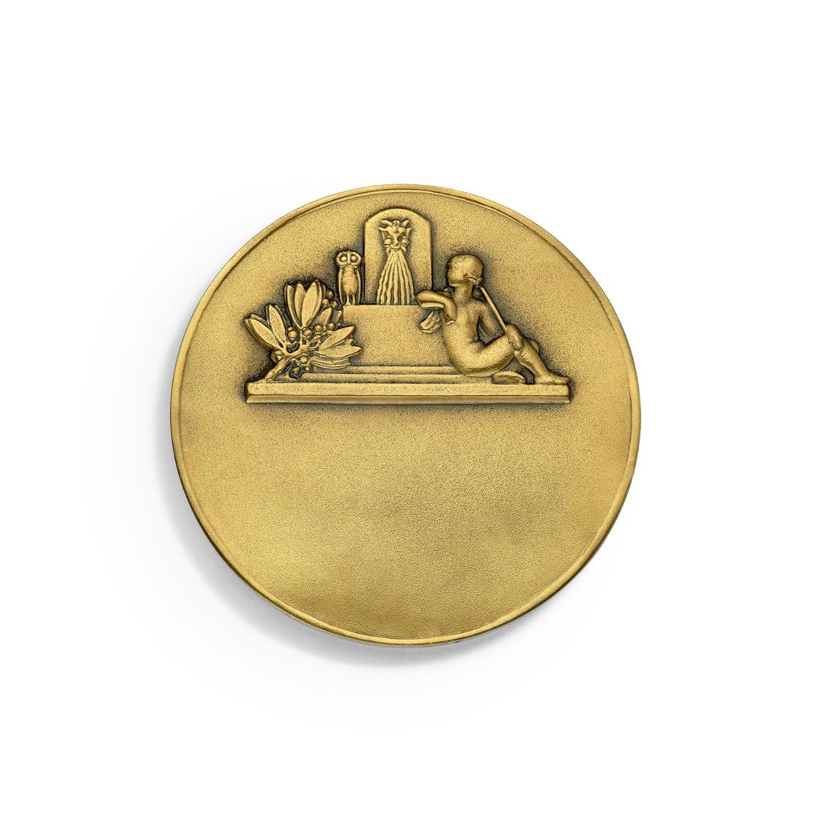 Cette médaille en finition bronze patiné, signée Dammann, met en scène une figure allégorique déversant l'eau d'une jarre avec l'inscription "Meliora Fundi" en exergue qui se traduit par "Je verse le meilleur".
