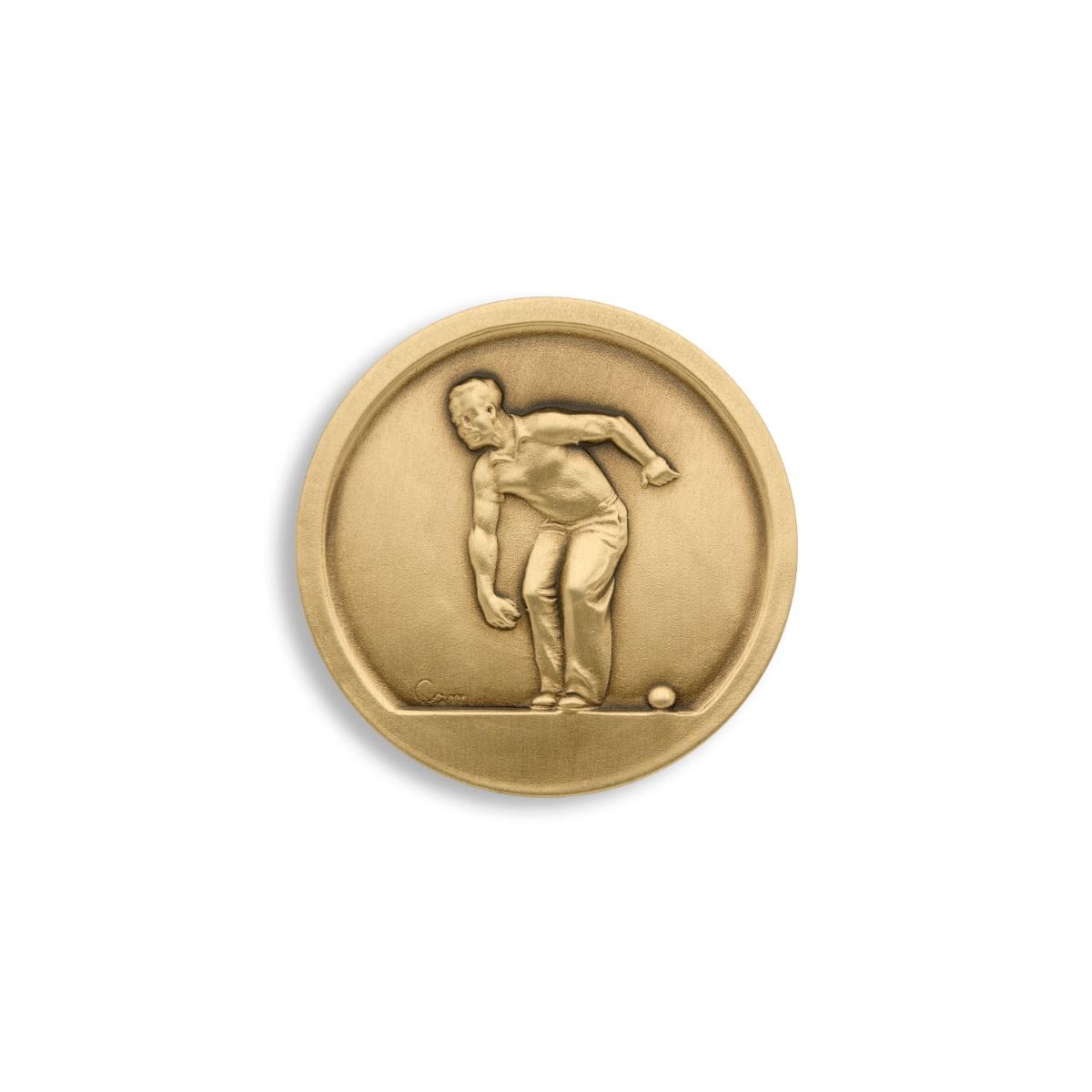 Visez l'excellence avec cette médaille illustrant un joueur de pétanque en plein tir.