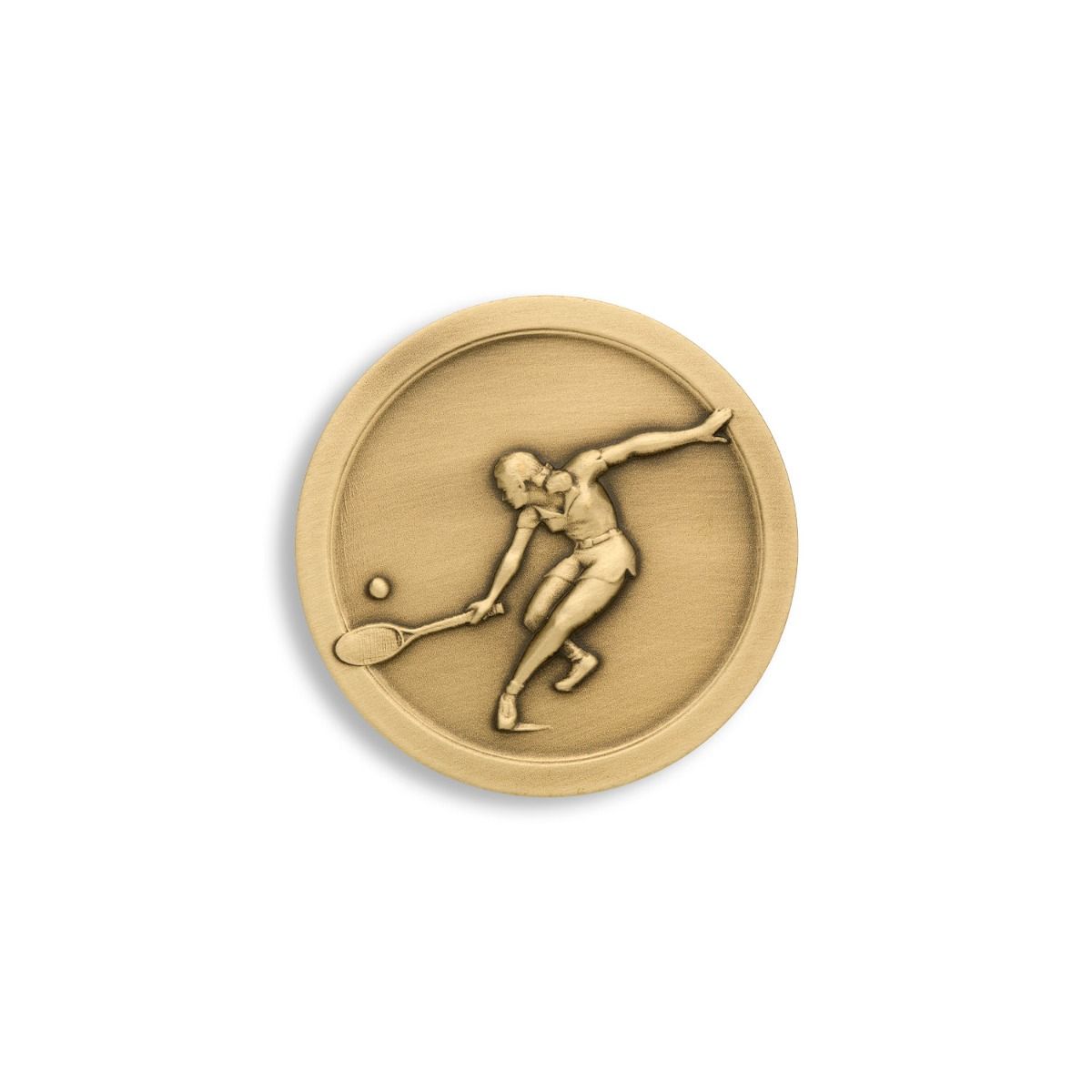 Célébrez le talent féminin au tennis avec cette médaille en bronze patiné représentant une joueuse en plein match.